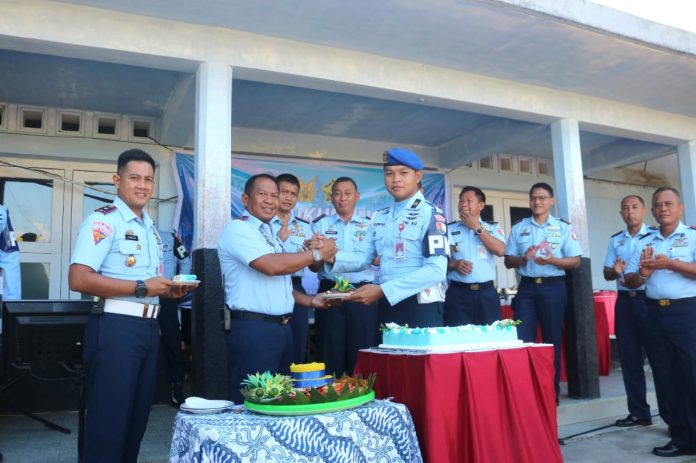 Komandan Lanud Raden Sadjad, Marsekal Pertama TNI Onesmus Gede Rai Aryadi, S.E., M.M., M.Han., melakukan pemotongan kue tart dan menyerahkannya kepada Dansatpomau Lanud RSA, Mayor Pom Chandra Putra Haryanto Hadiarta, S.T. Han.