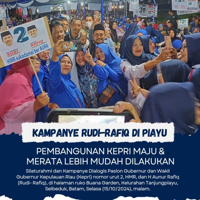 Seperti yang tampak dalam acara Silaturahmi dan Kampanye Dialogis Paslon Gubernur dan Wakil Gubernur Kepulauan Riau (Kepri) nomor urut 2, HMR, dan H Aunur Rafiq (Rudi- Rafiq), di halaman ruko Buana Garden, Kelurahan Tanjungpiayu, Seibeduk, Batam, Selasa (15/10/2024), malam.