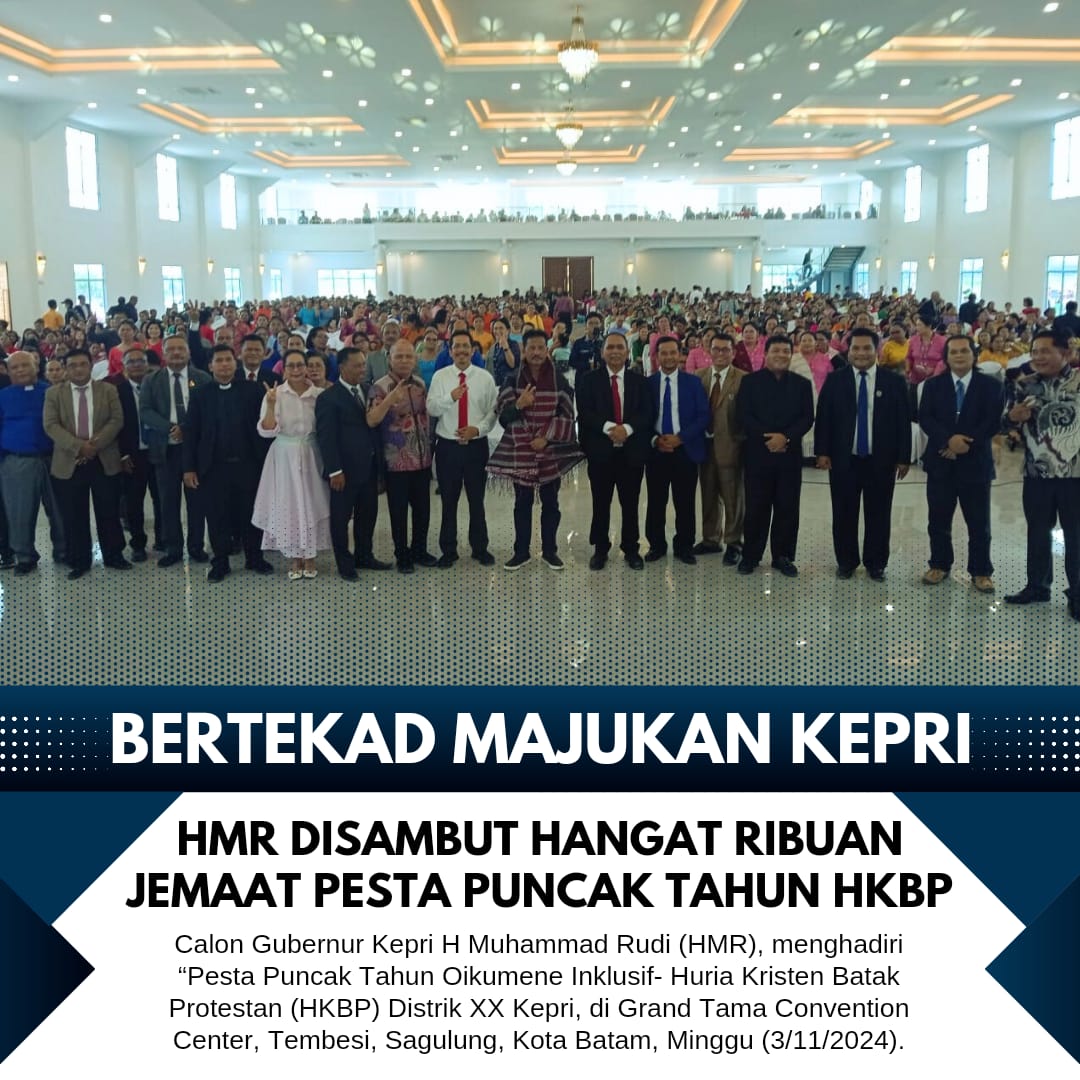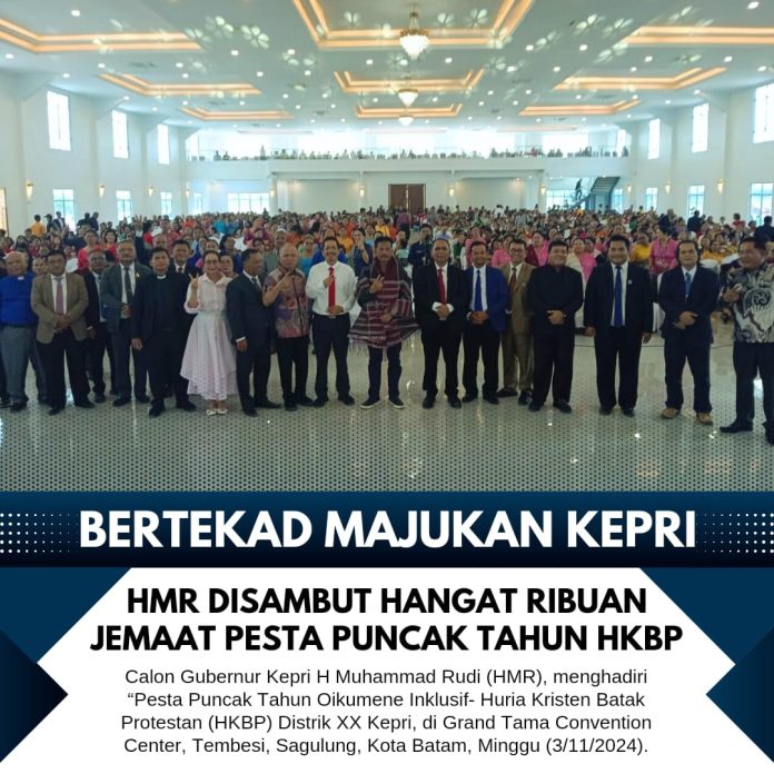 Batam – Calon Gubernur Kepulauan Riau (Kepri) H Muhammad Rudi (HMR), menghadiri “Pesta Puncak Tahun Oikumene Inklusif- Huria Kristen Batak Protestan (HKBP) Distrik XX Kepri, di indoor Grand Tama Convention Center, Tembesi, Sagulung, Kota Batam, Minggu (3/11/2024).