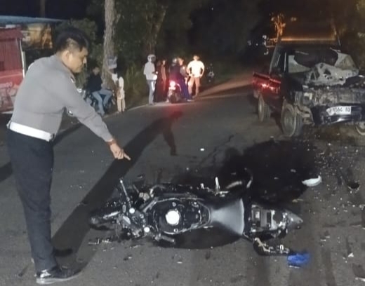 “Saat melintasi jalan menanjak, sepeda motor korban tiba-tiba berpindah jalur dan langsung bertabrakan secara frontal dengan mobil,” ungkap Iptu Bako.