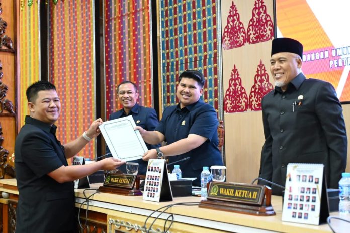 Bengkalis – Bupati Bengkalis diwakili Wakil Bupati Bengkalis H Bagus Santoso menghadiri Rapat Paripurna DPRD Kabupaten Bengkalis dalam rangka mendengarkan Pandangan Umum Fraksi-Fraksi terhadap Rancangan Peraturan Daerah (Ranperda) tentang Pertanggungjawaban Pelaksanaan Anggaran Pendapatan dan Belanja Daerah (APBD) Tahun Anggaran 2024, Senin (16/6/2025), di Ruang Rapat Paripurna DPRD Kabupaten Bengkalis.