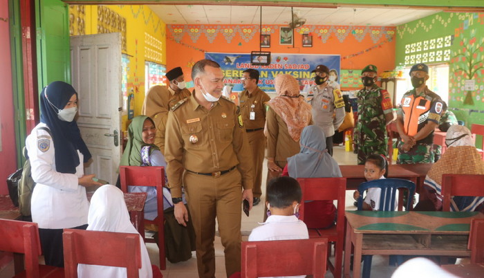 Natuna – Wakil Bupati Natuna, Rodhial Huda meninjau langsung serbuan vaksinasi anak 6 – 11 tahun yang digelar oleh Rumah Sakit TNI Angkatan Udara (RSAU) dr. Yuniati Wisma Karyani Lanud Raden Sadjad di Sekolah Dasar Negeri (SDN) 005 Sepempang, Kecamatan Bunguran Timur, Kabupaten Natuna, Provinsi Kepulauan Riau, Senin (10/1/2022).