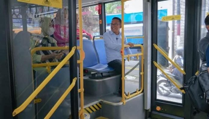 Bursakota.co.id, Medan – Wakil Wali Kota Medan Zakiyuddin Harahap menggunakan bus listrik untuk berangkat ke Kantor Wali Kota Medan, Selasa (25/2).