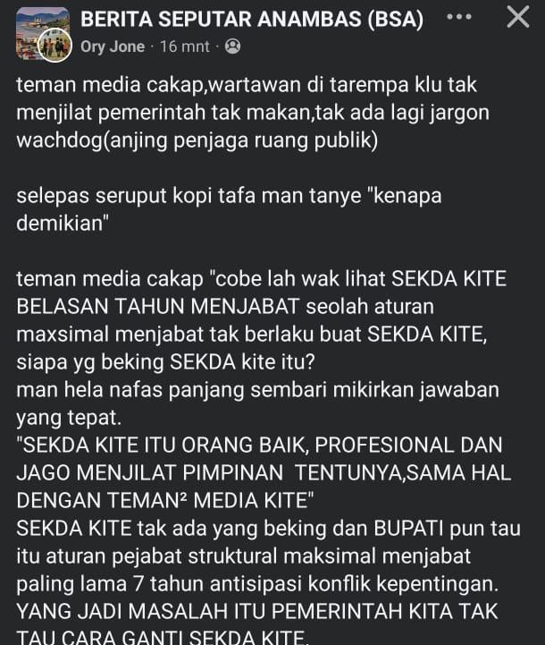 Akun tersebut diduga telah menyebarkan narasi yang mengandung penghinaan dan fitnah dengan menggeneralisasi profesi jurnalis sebagai “penjilat” di grup Facebook Berita Seputar Anambas.